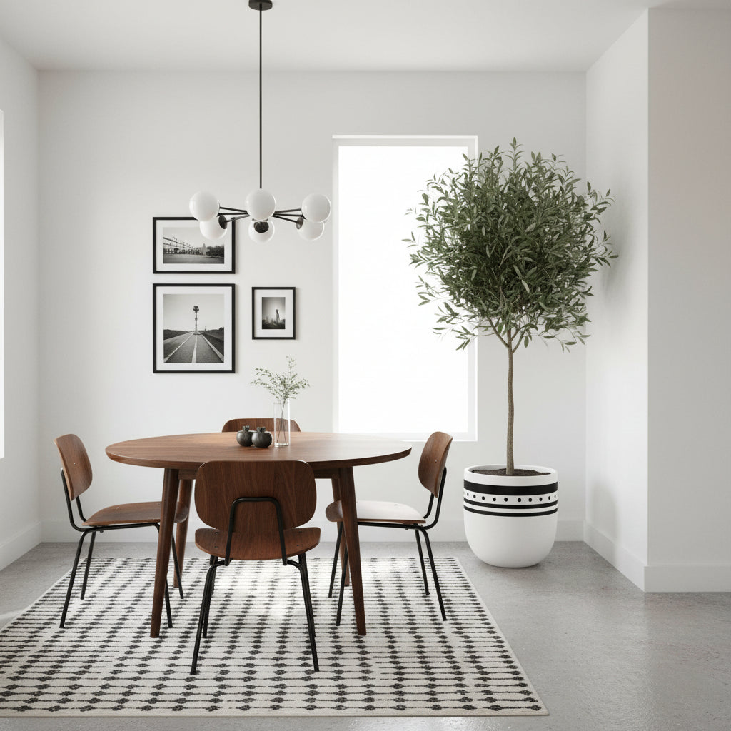 Modern dining room with wooden table and chairs, decorative plant, and framed pictures on the wall.