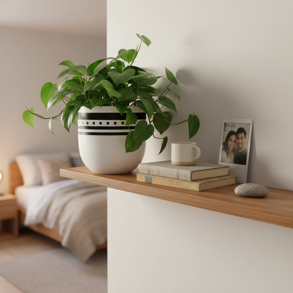 Wooden shelves with decorative items including a plant, books, and a vase against a plain wall.