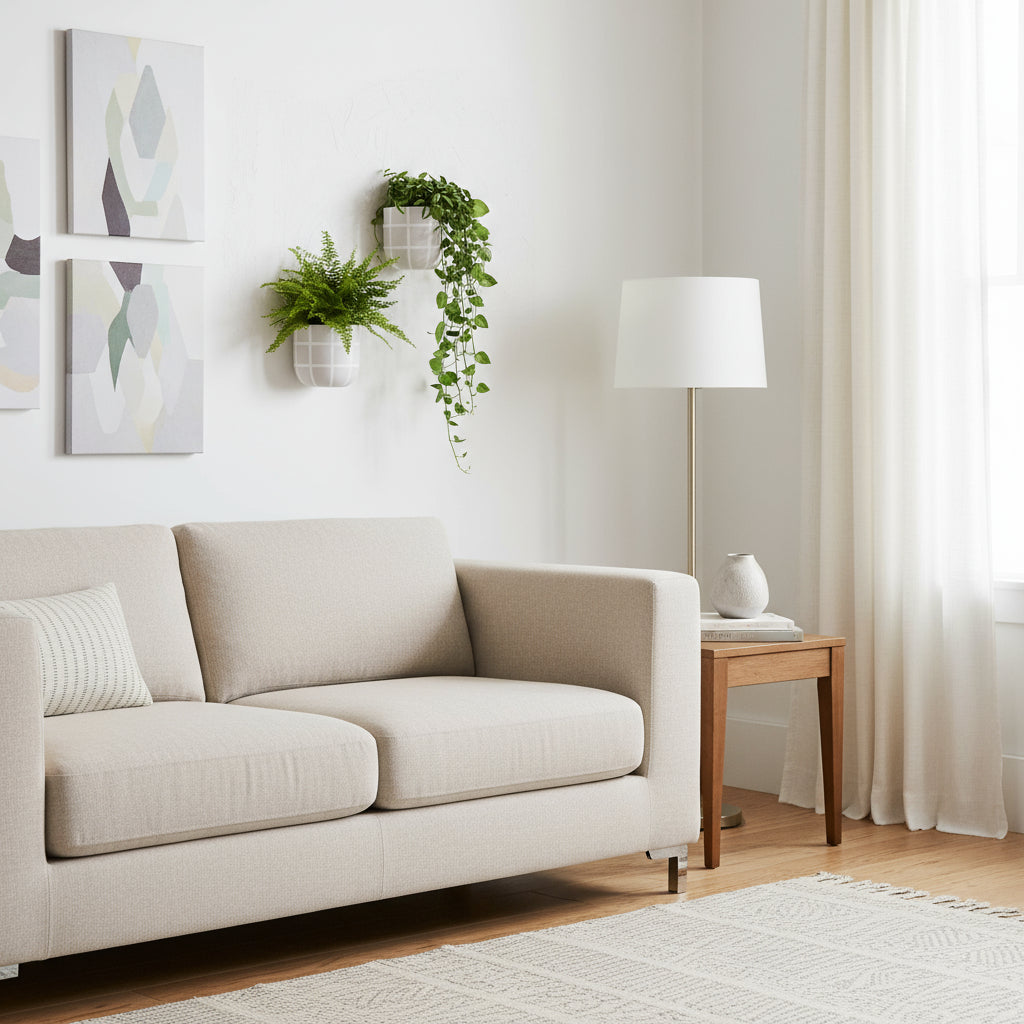 Modern living room with a beige sofa, side table, lamp, and wall art.