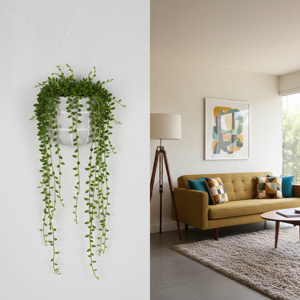 Two wall-mounted planters with green plants on a white wall, with a room in the background.