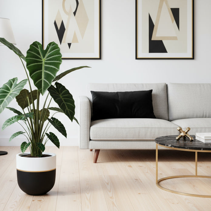 A two-toned fiberstone planter with a thin stripe of gold, placed on a floor in a room with a cat, chairs, and a table.